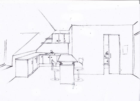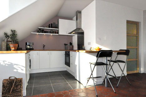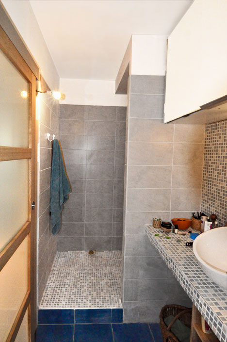 La cuisine et la salle de bain sont totalement modifiées : la cloison existante est repoussée de 50 cm sans perte de surfaces utiles.