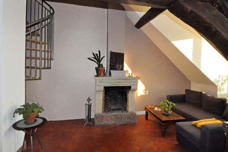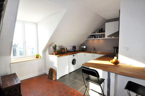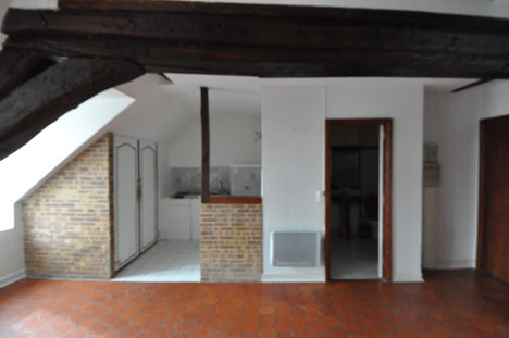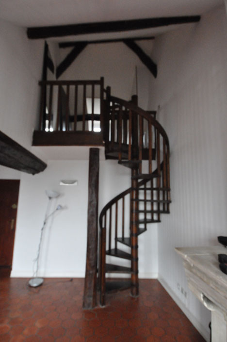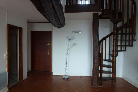 Un duplex atypique sous les toits où tout est à refaire : un escalier branlant donne à l'étage sur une pièce ouverte, cuisine et salle de bain vétustes, peu de rangement et pour finir un design révolu.