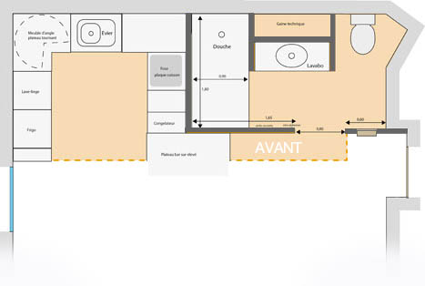 L'avant et l'après sur plan : Par rapport à l'ancien (en orange), nous avons récupéré pour la pièce à vivre 50 cm sur la salle de bain tout en créant une grande douche de 90cm sur 2m
