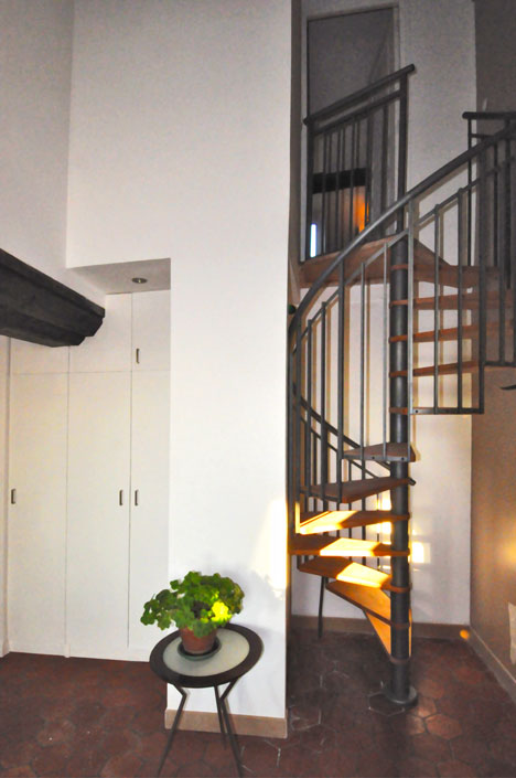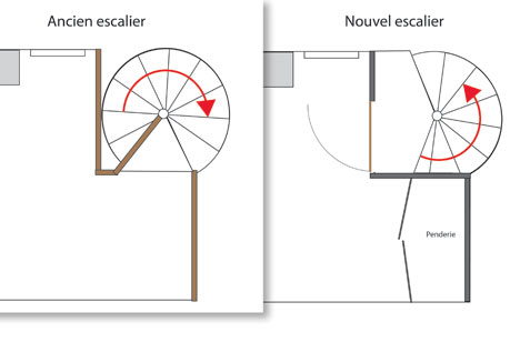 Dans la chambre, l'inversion du sens de l'escalier a permis d'utiliser une partie du passage pour créer une penderie.